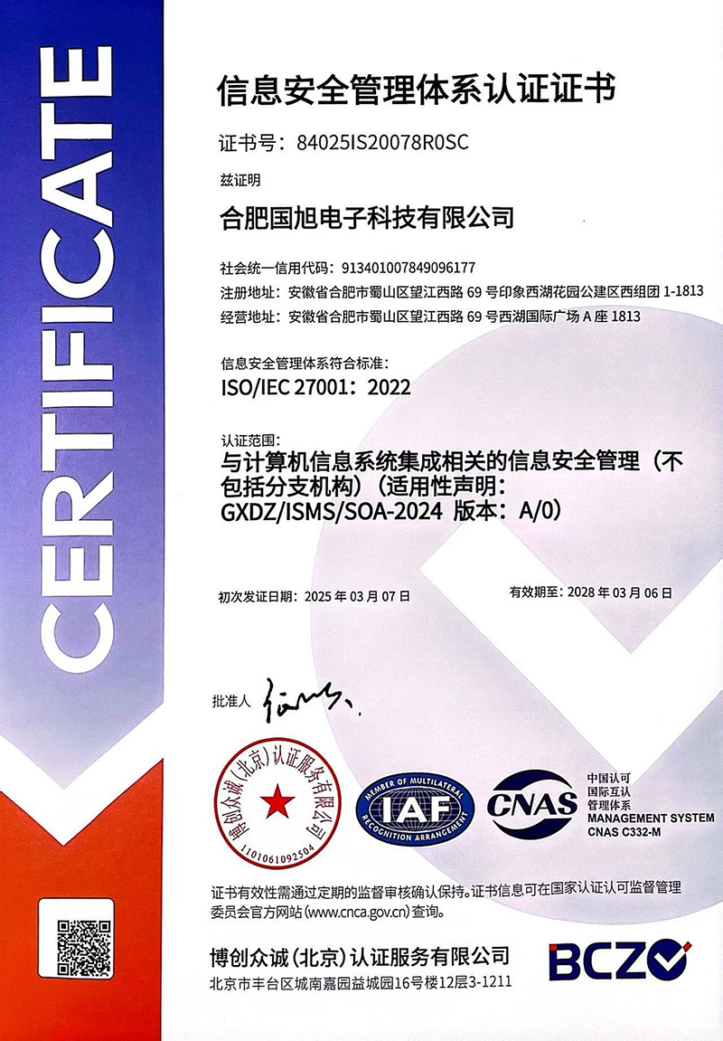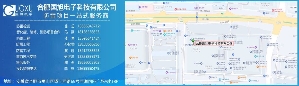 合肥國旭電子科技有限公司創立于2006年,總注冊資本2008萬。公司總部地址位于安徽IT主流商圈核心,合肥市蜀山區望江西路與肥西路交口西湖國際廣場。 公司是專業從事智能防雷檢測系統、智能化工程設計與施工工程、防雷設計施工工程、數據中心機房、消防工程、網絡監控安全技術防范工程、及智能變電站安全預警系統。